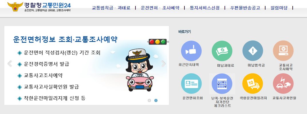 과속, 신호위반 등의 여부를 확인하고 싶으면 교통범칙금 인터넷 납부시스템에서 조회를 해 볼 수 있습니다.