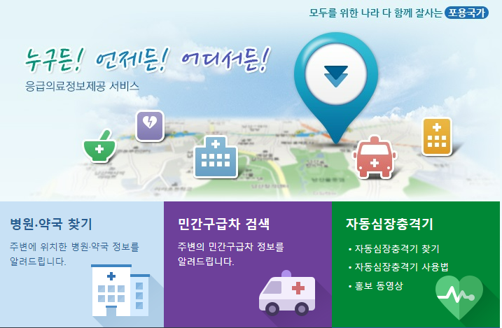 병원·약국 찾기와 민간구급차 검색도 가능하고, 자동심장충격기(AED)가 비치된 장소에 대한 조회까지 가능합니다.