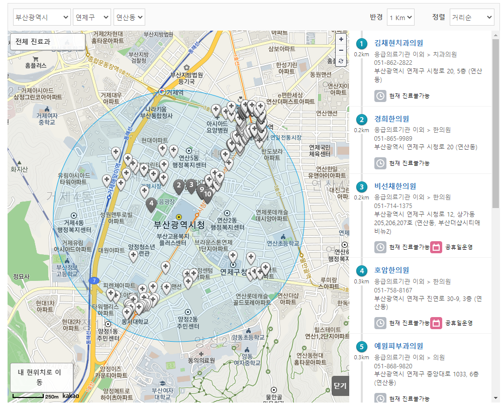 심야에도 운영하는 병원도 확인해 볼 수 있습니다. 현재 시간 기준으로 영업을 하는지도 표시가 되니까 일요일에 진짜 긴급하게 병원을 가야 할 일이 있다면 꼭 확인을 해 보시기 바랍니다.